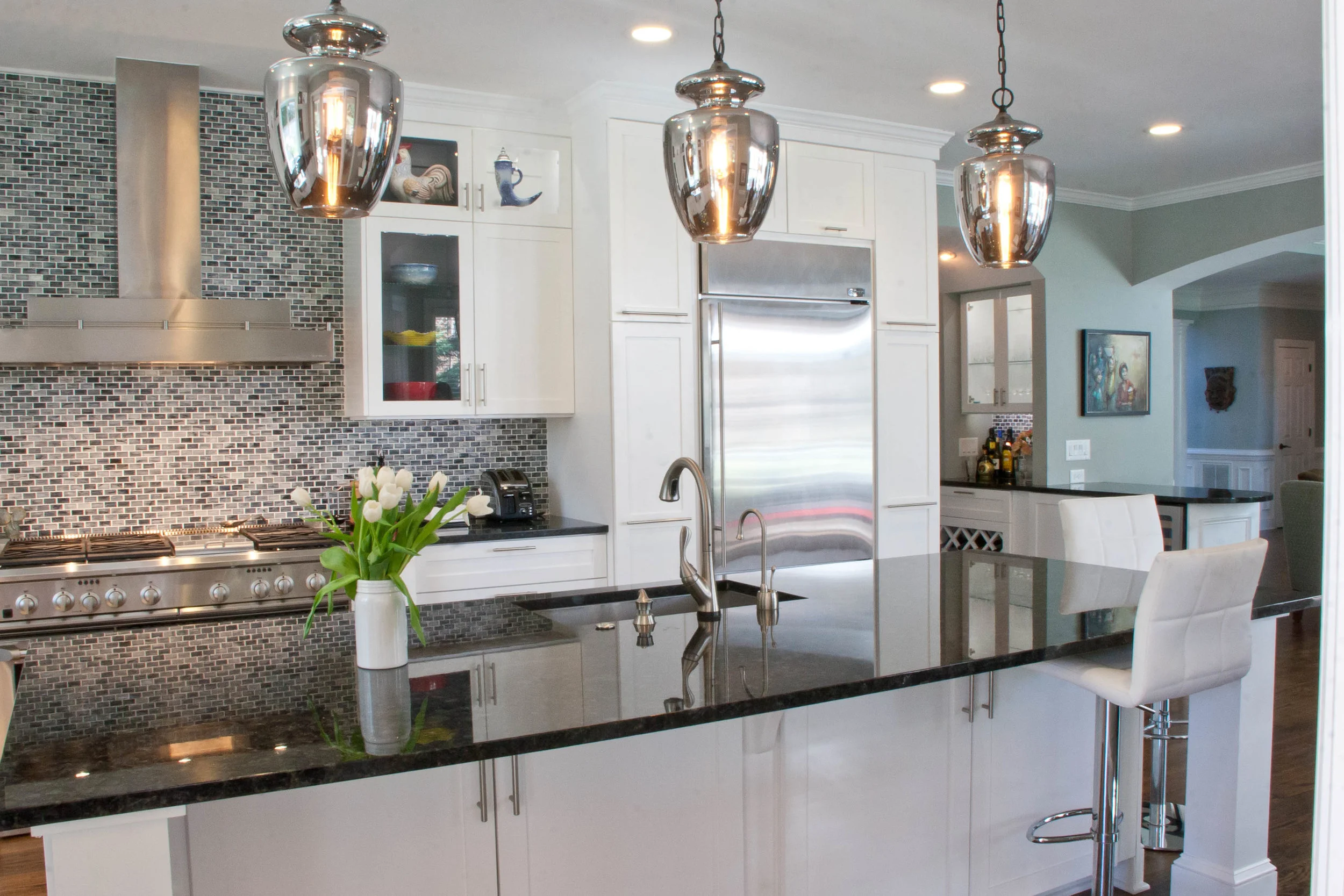 The sliding glass doors between the kitchen and sunroom completely disappear into the wall pockets and make this a premiere entertaining space by creating open flow between the spaces.